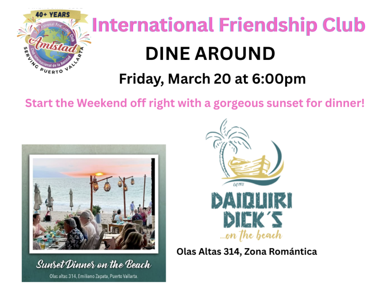Join in the fun at our IFC Dine Around on Friday, March 20 at 6:00 PM at the ever-popular Daiquiri Dick’s!
